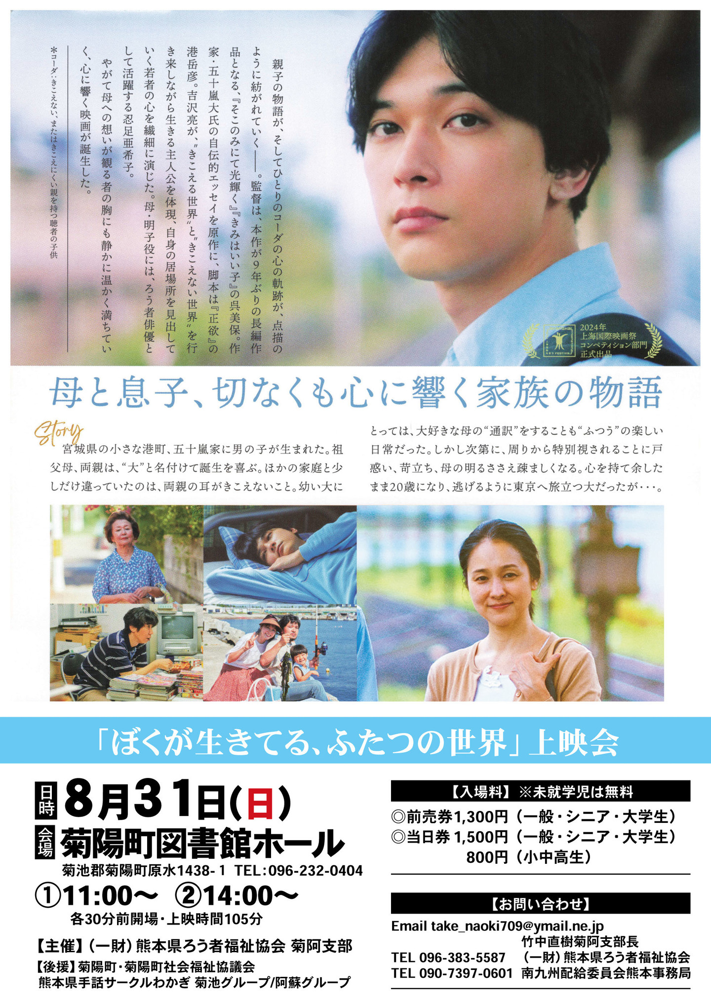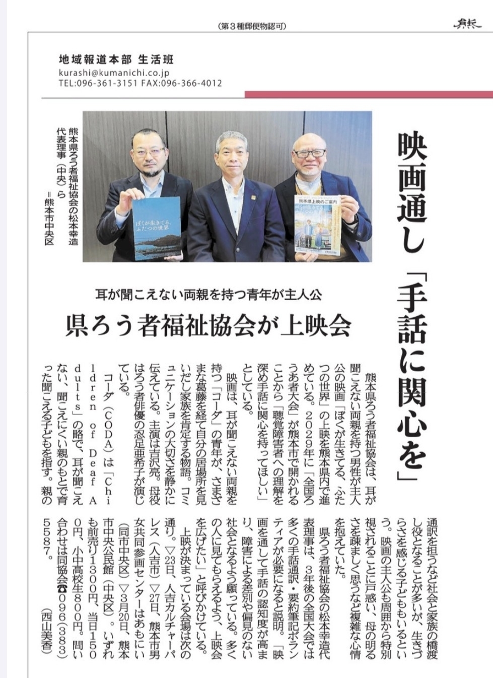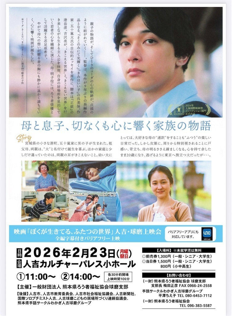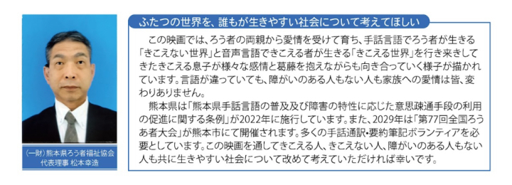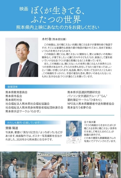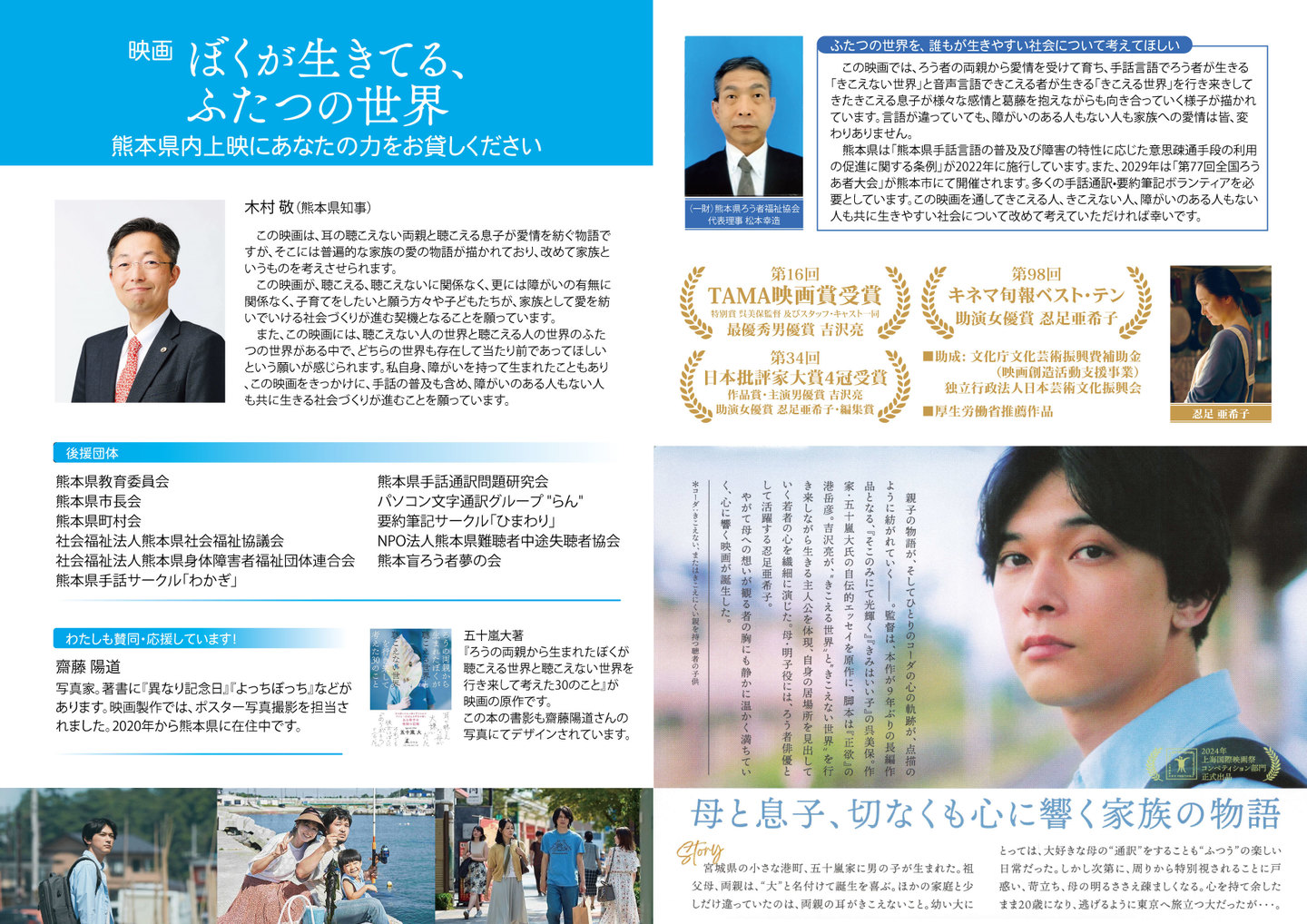 “熊本県内アンコール上映”は、(一財)熊本県ろう者福祉協会と映画『ぼくが生きてる、ふたつの世界』南九州配給委員会で“上映をすすめる会”を立ち上げ、熊本県内アンコール上映推進します。