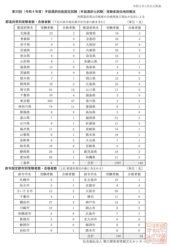 第33回(令和4年度)手話通訳技能試験(手話通訳士試験)受験者居住地別概要
