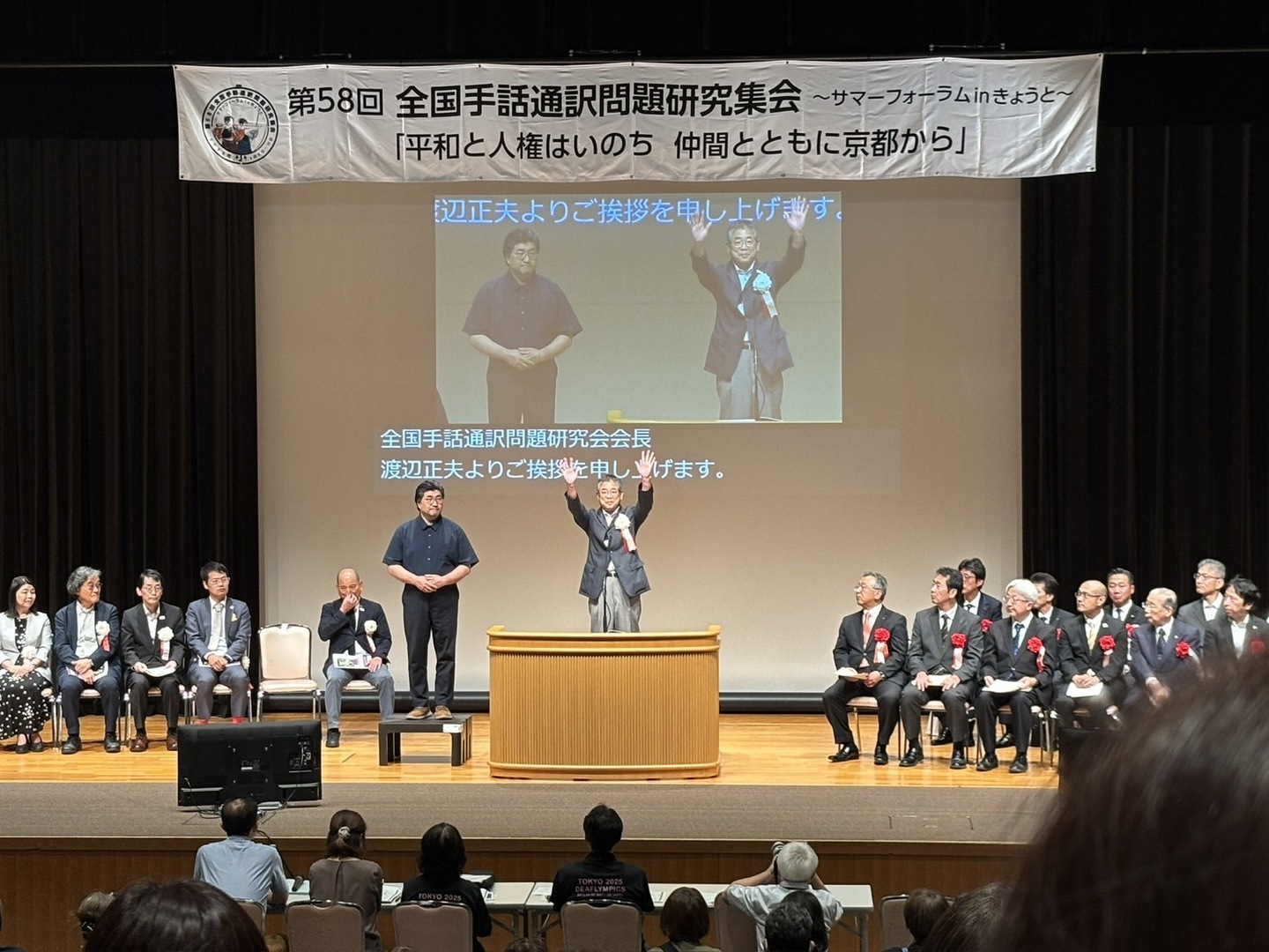 𠮷田航実行委員長は「京都の文化も楽しんで」と呼びかけ、石橋大吾全日ろう連理事長は「デフリンピック開催の節目の年、歴史を振り返り力を合わせよう」と語った。渡辺正夫全通研会長は「創立50年を経て、さらなる発展をめざす」と述べ、今後の研究と運動の継続を誓った。